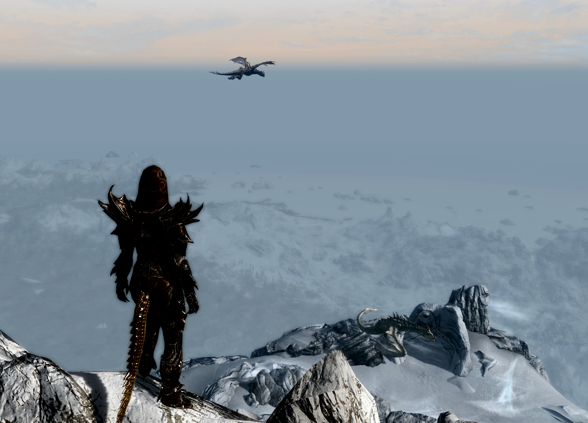 I finished the base game “World Eater” main plot-line today, so here is my character standing on top of the “Throat of The World” mountain, at dusk looking down upon the dragon Paarthunax:
