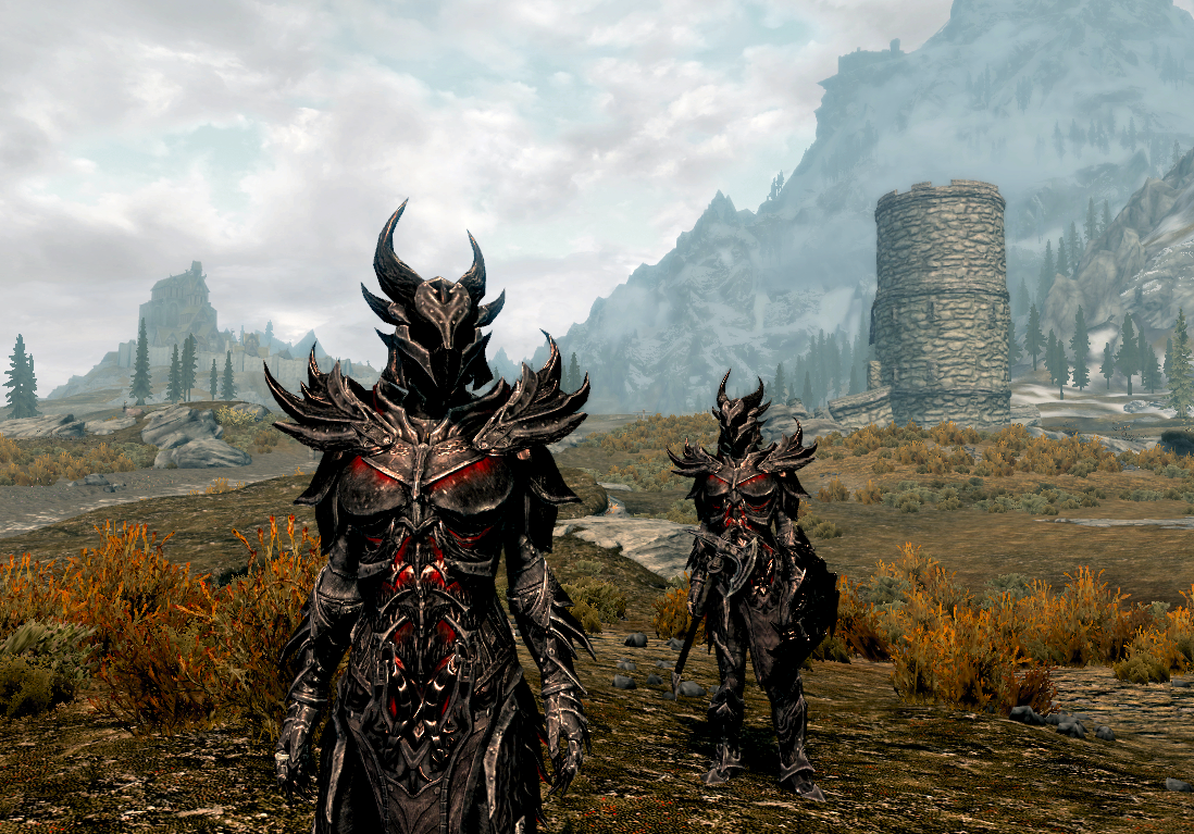 Here is a screenshot of my character and follower in their matching full sets of Daedric Heavy Armour that I forged and enchanted: