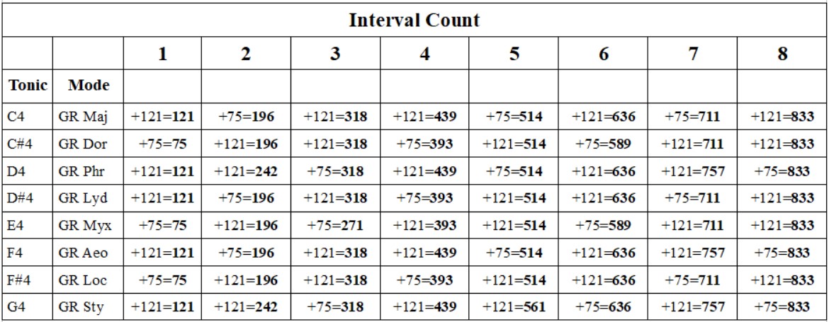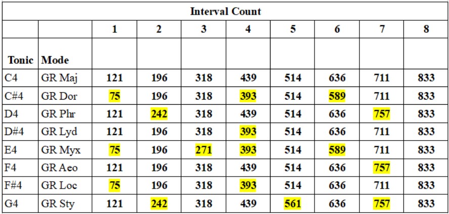 In other GR Modes, some of the characteristic intervals cannot be played – the highlighted intervals in TABLE 3 are those that arise out of the pattern rotation, and introduce different sonic signatures.