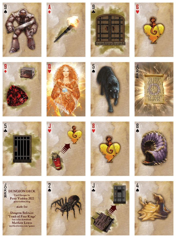 This is a deck of 54 cards that I created to complement and enhance the player’s experience of the solo card game “Dungeon Solitaire: Tomb of Four Kings” created by Matthew Lowes. ToFK can be played with an ordinary deck of standard playing cards – but I thought it might be nice to have an illustrated deck to add some ambiance, and enhance immersion in the fantasy dungeon delve. Matthew has kindly given me permission to make the deck available to fans of the game.