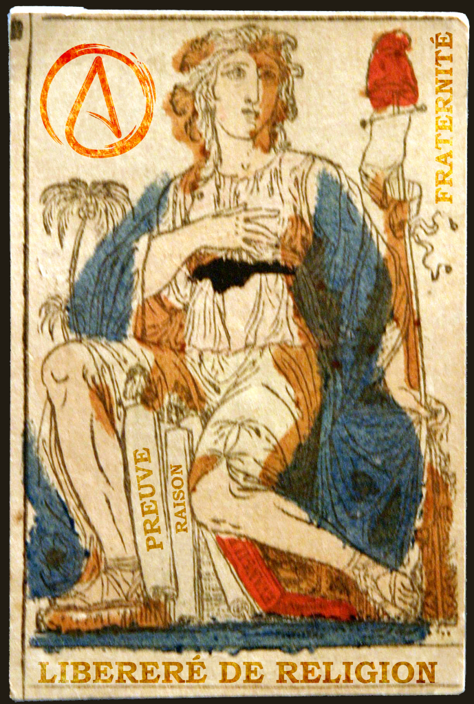 The image is of Liberty represented as a woman seated and holding a triumphal banner. Two scrolls at her feet represent the philosophical foundations of a sane society – Evidence, and Reason. At top right is “Fraternity”. At top left is the European symbol for atheism. The card title at the lower edge reads “Freedom from Religion”.
