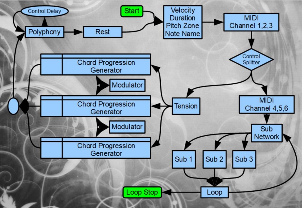 I used multiple variants of a highly tunable network of my own design – incorporating a weighted histogram basis for random selection of properties such as note name, note length, note velocity, and keyboard section. A “tension level” selector chooses a range for the size of intervals to be used in chords, before dropping control into the top of one of a number of “cascade” style random chord-progression generators which are also capable of modulation. Looping around the network then also includes built-in random-length note rests and polyphony level histograms, whilst simultaneously selecting and playing one of a number of “embellisher” sub-networks which are capable of layering psuedo-melodic motifs on top of the chords. The network controls different instruments with which to voice up to a maximum of six parts being generated.