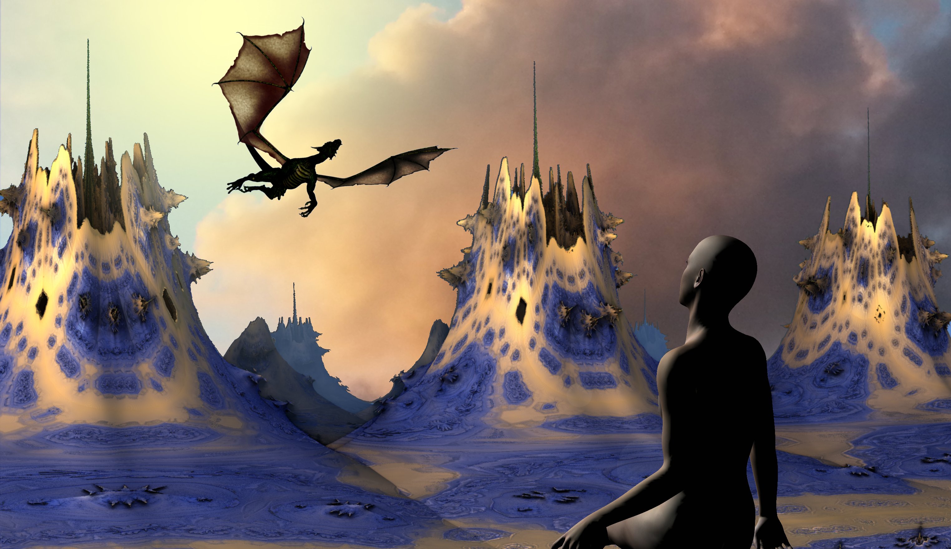 September 26, 2017 Peter The Call Still experimenting with fractal generated landscapes. In “The Call” the view is into the (mostly obscured but still bright) local star, so the main figures – humanoid and air-borne creature – had to be quite dark, almost in silhouette. “The Call” Share this: Click to share on Pinterest (Opens in new window) Pinterest Click to share on WhatsApp (Opens in new window) WhatsApp Click to email a link to a friend (Opens in new window) Email Click to share on Reddit (Opens in new window) Reddit Click to share on X (Opens in new window) X Click to share on Facebook (Opens in new window) Facebook